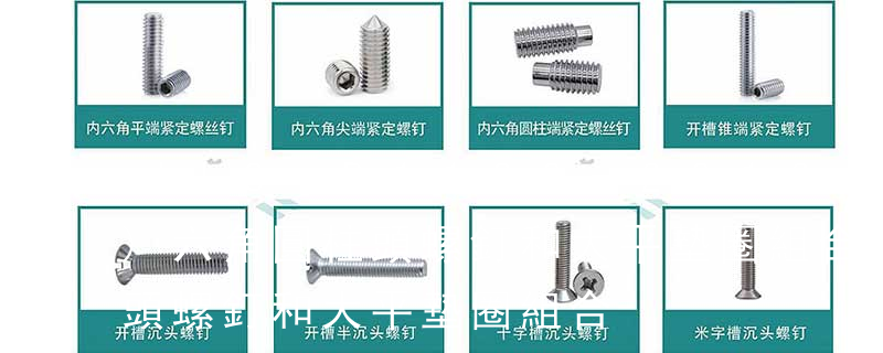 1.機螺釘 2.自攻螺釘 3.鉆尾螺釘 4.墻板釘 5.纖維板釘 6.木螺釘7.六角木螺釘 8.不脫出螺釘 9.組合螺釘 10.微型螺釘 11.家具螺釘 12.電子螺釘頭型:1.六角頭(hexagon head) 2.六角頭法蘭面(hexagon head with flange) 3.