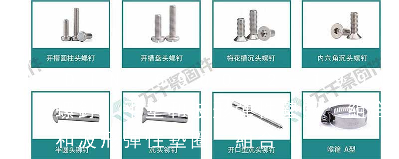 波形墊圈、彈簧墊圈、開口擋圈、軸用擋圈、孔用擋圈、內外齒鎖緊墊圈、內外鋸齒鎖緊墊圈、方墊圈④、 螺釘類:十字盤頭自攻釘DIN7981/GB845-85、十字沉頭自攻釘DIN7982/GB846-85、十字大扁頭自攻釘DIN968/GB845、十字盤
