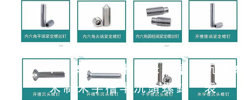 1.機螺釘 2.自攻螺釘 3.鉆尾螺釘 4.墻板釘 5.纖維板釘 6.木螺釘7.六角木螺釘 8.不脫出螺釘 9.組合螺釘 10.微型螺釘 11.家具螺釘 12.電子螺釘 13.鏈帶螺釘頭型 :1.六角頭(hexagon head)2.六角頭法蘭面(hexa